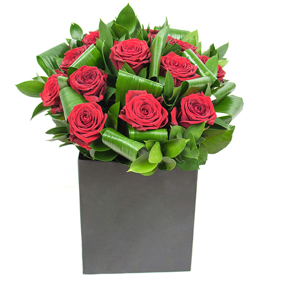 Embrace sophistication with our sophisticated red rose bouquet, a perfect blend of vibrant red roses, lush aspidistra leaves, and delicate ruscus. This elegant arrangement is designed to enhance any space with its timeless beauty.